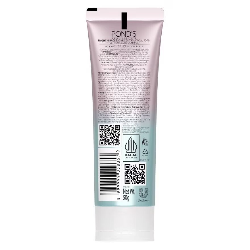 Pond'S Bright Miracle Ultimate Acne Solution THYMO-BHA Facial Foam REDUCE ACNE IN 3 DAYS NEW POND'S Bright Miracle Ultimate Acne Solution Facial Foam that is clinically proven to reduce acne in 3 days. With a potent blend of ingredients founded by the POND'S SKIN INSTITUTE. THYMO-BHA Active Thymo-T Essence amp; BHA to strengthen skin protection from acne-causing bacteria. Reduces acne breakouts. NIASCORCINOLTM, is a potent blend of Niacinamide and E-Resorcinol for 10X brightening power Feel the Miracle of your Ultimately brighter amp; clearer skin far from acne. Wet your face, create lather, gently massage then rinse off. Use daily. D E R M A T O L O G I S T T E S T E D