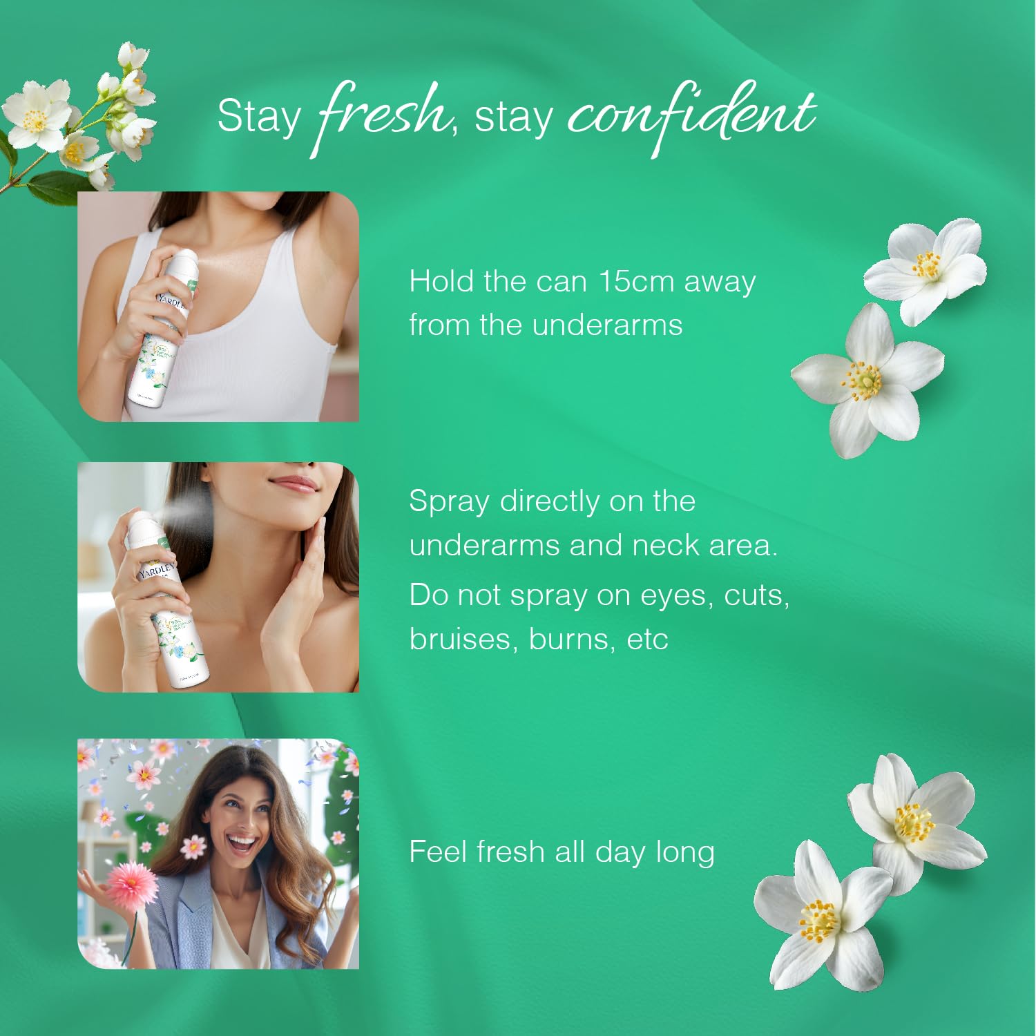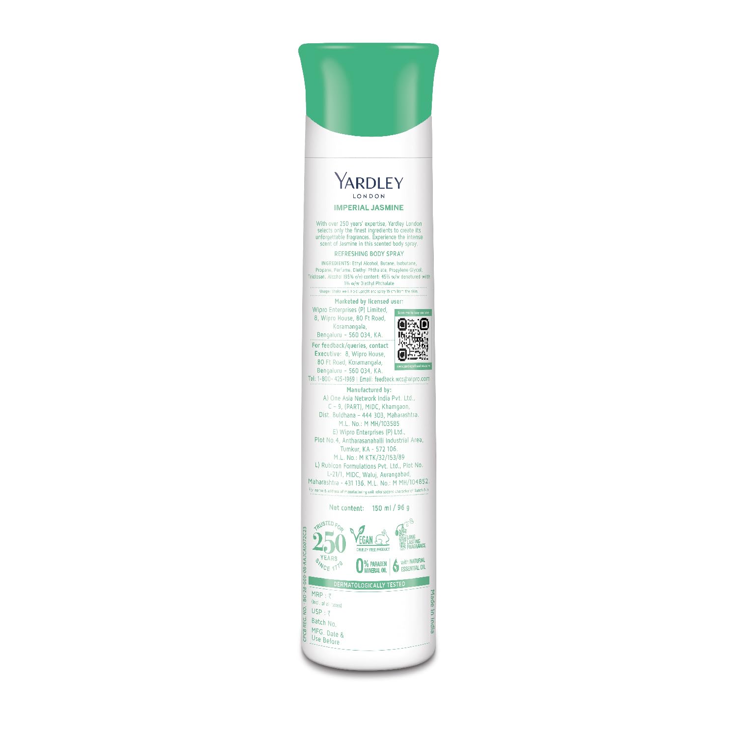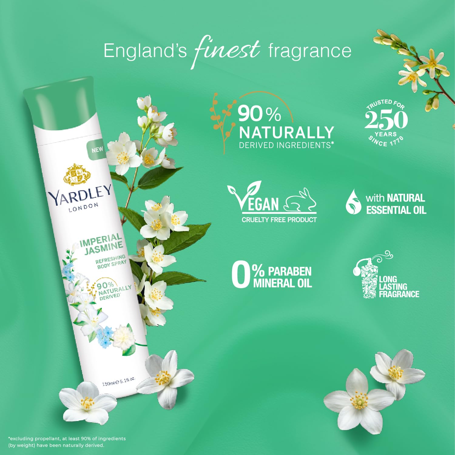 Brand Yardley Item Form Spray Scent Jasmine Special Feature Natural Ingredients Material Feature Natural Number of Items 1 Net Quantity 150.0 millilitre Item Volume 150 Millilitres Use for Body Target Audience Women